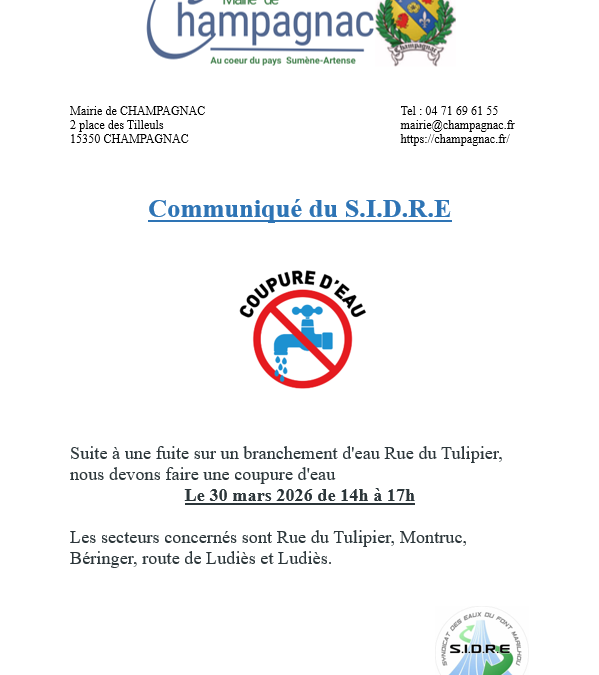 Communiqué du SIDRE : coupure d’eau